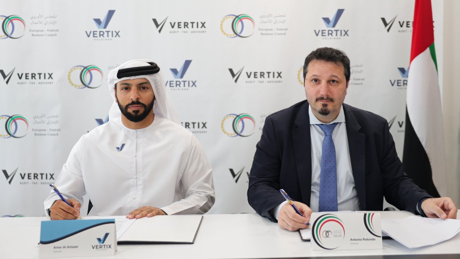 The MoU was signed by Mr. Amer Al Ahbabi, Chairman of Vertix Holdings, and Antonio Rotondo, Chairman of the European Emirati Business Council (EEBC).